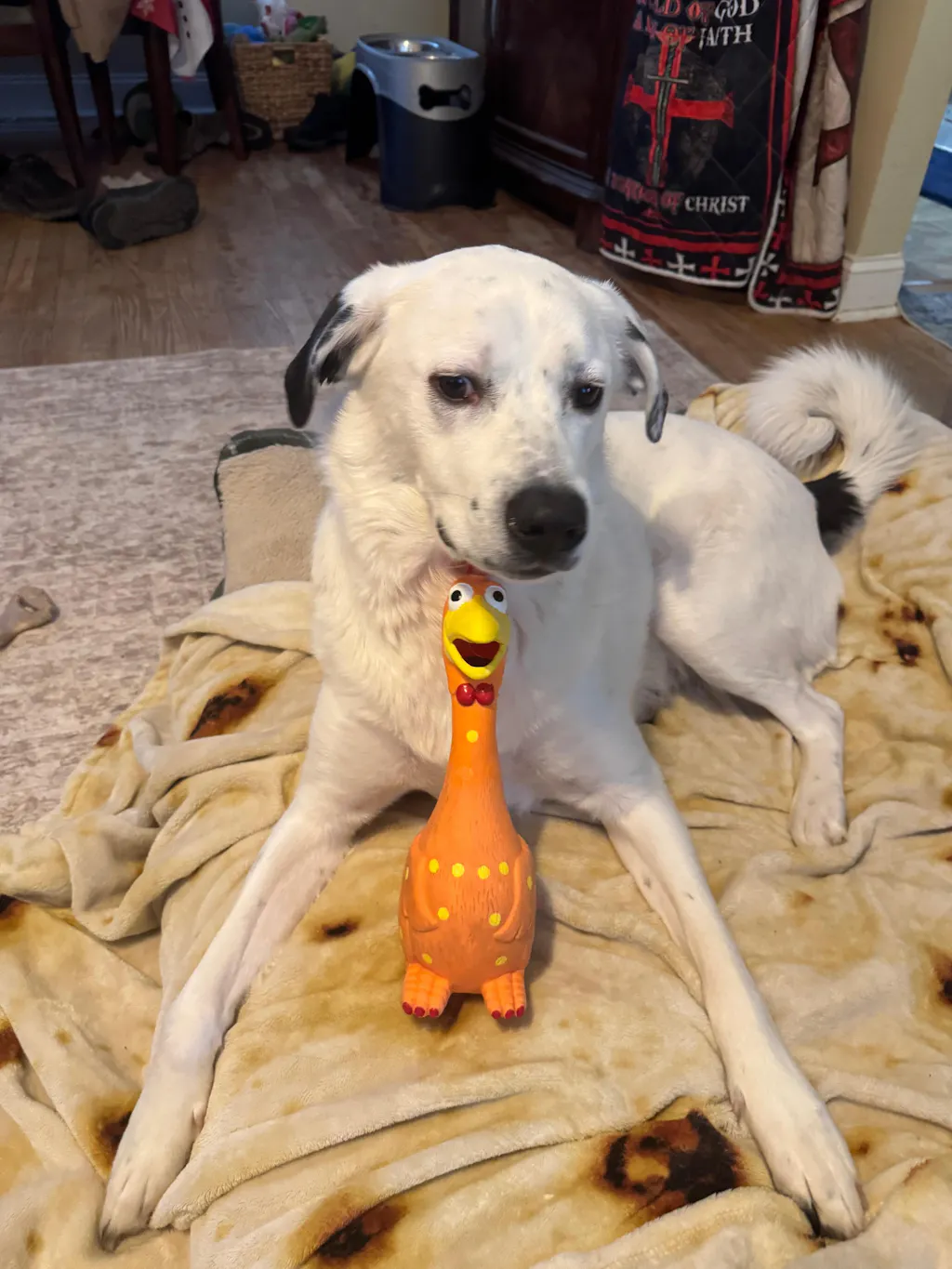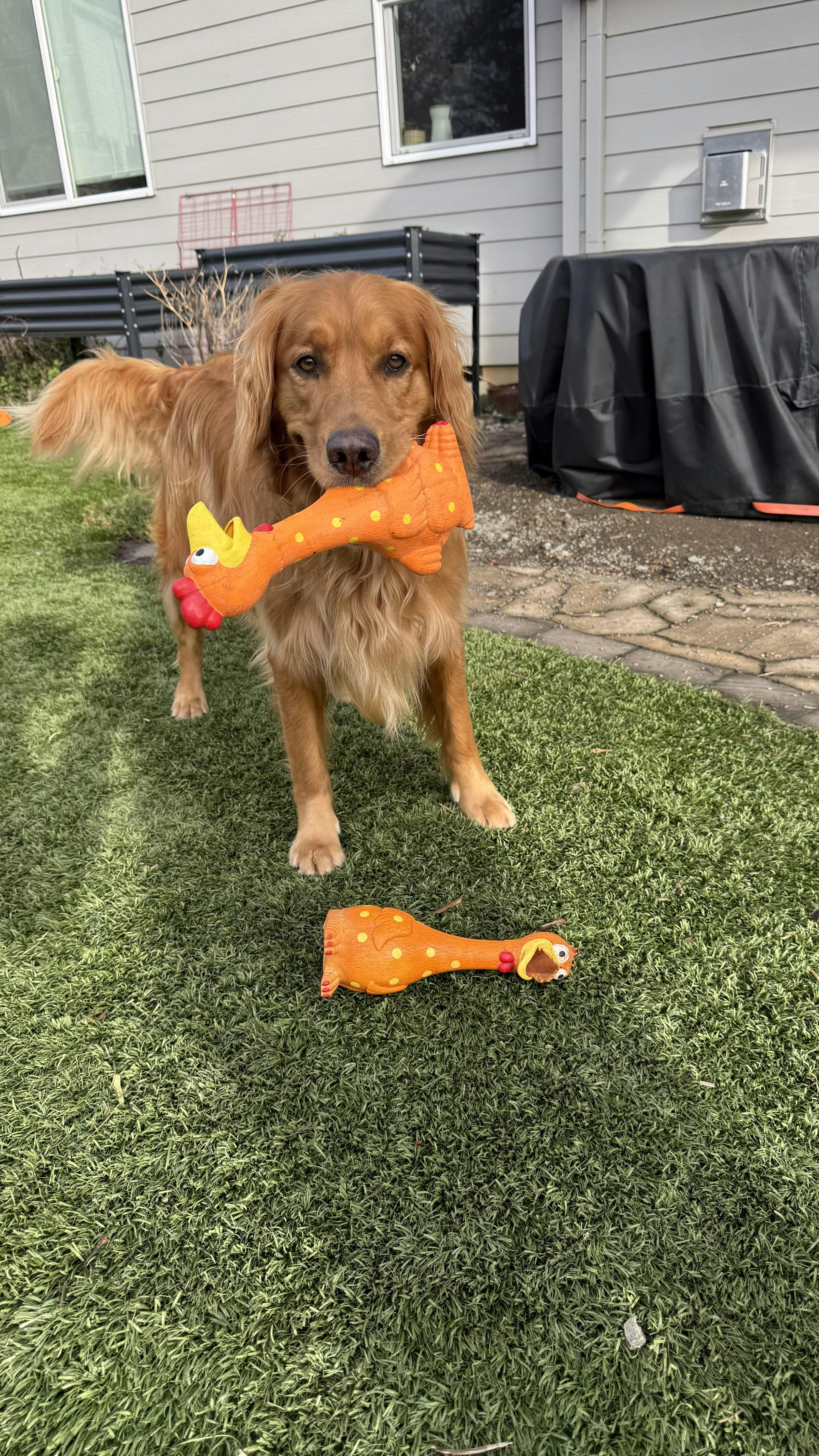 ⚠️ Note: Camp Clucker is a soft-play squeaker, not a chew toy. Supervise your pup during play and remove if damaged.